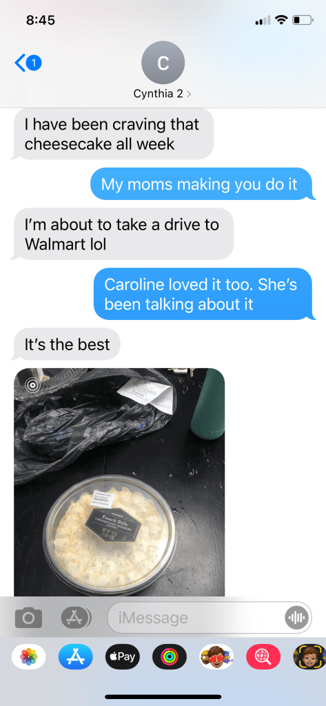 Anyway, we eventually make it to Wal-Mart to grab bread. One thing. But while we’re there, we stop at the book section because again, she’s her mother’s child, and then she asks if we can get Welch’s sparkling grape juice. “It was mine and Mamaw’s favorite.” So we get some. And then over in the bread section, we find my mom’s idea of the holy grail of junk food. French cheesecake. I can remember being 12 years old and eating this stuff on the beach, or in the living room floor while watching movies, or in the car on the way home from the store because, who was going to stop me?