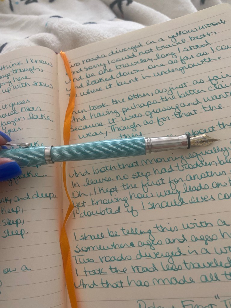 This year on my birthday, I got an Aquamarine Waldemann, and Cathie had already found the perfect ink: Diamine Spearmint Diva with flecks of silver. I’ve filled it up three times since I picked it up a couple of weeks ago, obviously a new favorite. For a long time now, I’ve had my eye on a journal there with cotton paper and soft wrapped leather, so I got that as a happy birthday to myself, and now I’m saving it for the perfect idea to strike. I’ve found that words that are left in someone’e own handwriting are priceless. I’ve found this to be true with going through my mom’s journals, appreciating how her words are still guiding me now that she’s gone.
