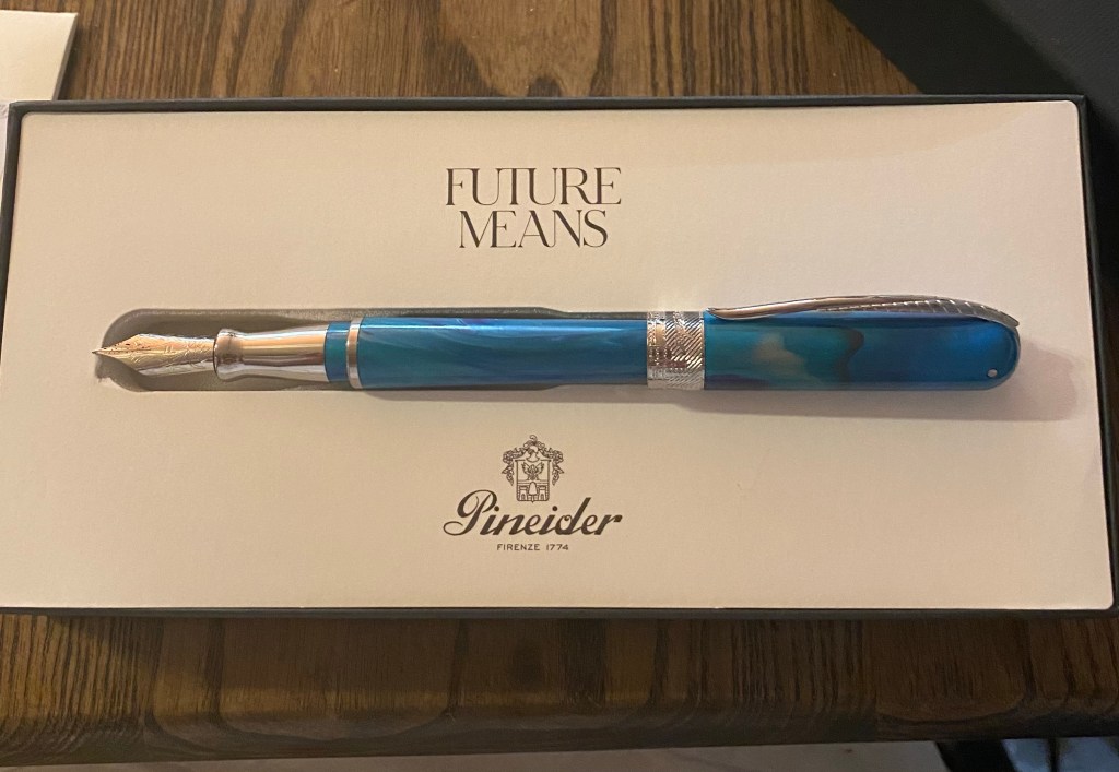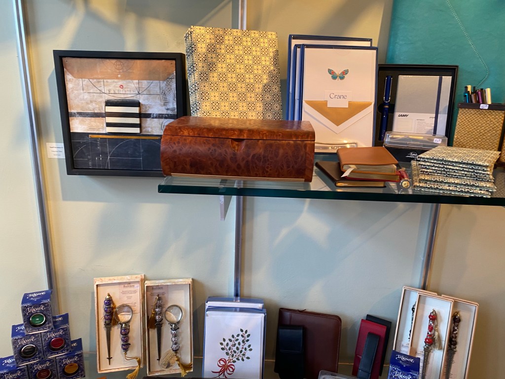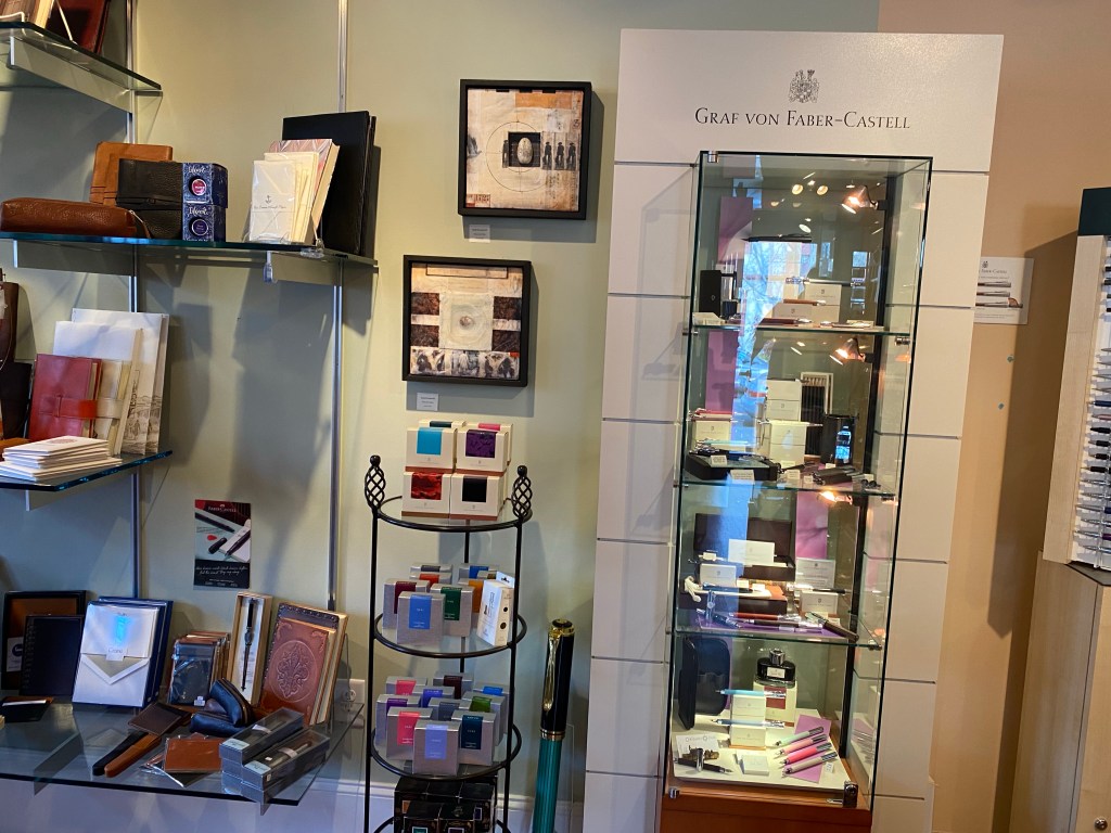 Every time I go in, I meander the cases until I find a pen that speaks to me, and then Jonathan and Cathie let me try it out, see if it “feels” right. Then the real fun starts: finding the perfect ink. For every pen, I have a different color-coordinated ink, usually with sparkles in it. I don’t know why, but I can’t just put black or blue ink in a pen. It needs to coordinate with the color of the resin or reflect the silvers and golds of the nibs. Cathie has noticed that I tend to buy pens and inks near the same colors as my finger nail polish, and I’m not sorry. I guess my moods are in charge here.
